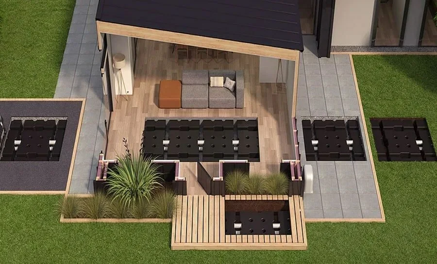 Encased in concrete: In a slab foundation, under a driveway or carpark. The pods can be stacked up to three high under decks or under houses on piles, or under your garden/lawn. The only limitation is your imagination!