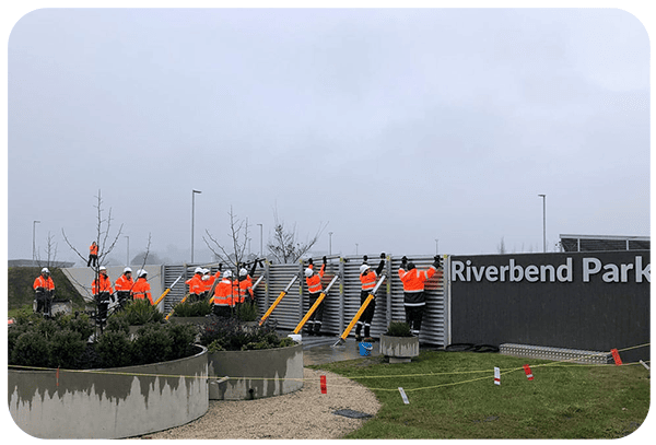 In the event of a flood warning, a streamlined deployment process ensures swift response and effective protection. Specially designed storage racks, complete with all necessary components such as posts, Acrow Props, and barrier segments, are transported to the site.